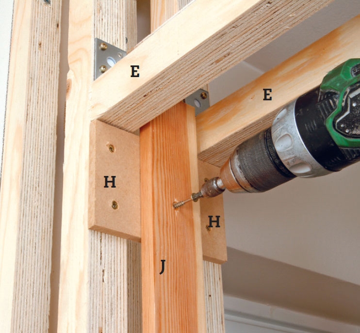 Sæt lægter (E) i overkanten af dørhullet på begge sider. Underkanten af lægten skal være i niveau med overkanten af dørpladen. Lægten gøres fast med vinkelbeslag og skruer.