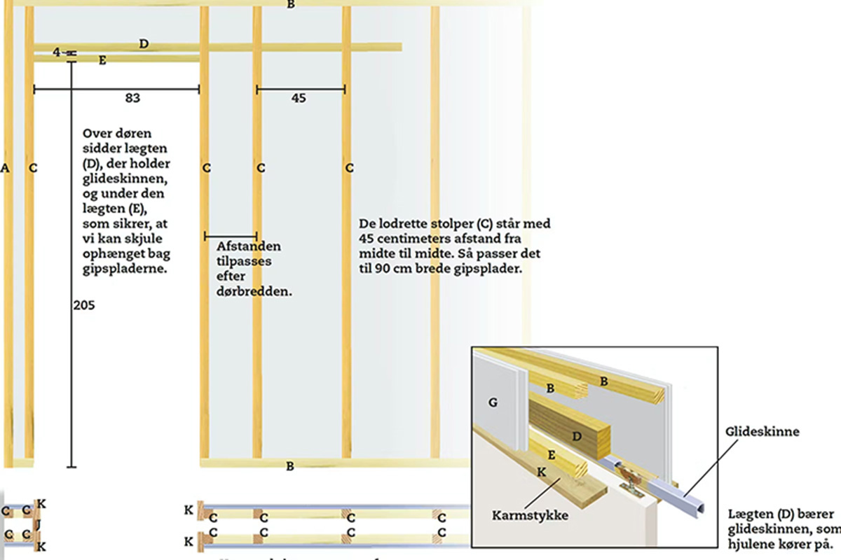 Ved at lave væggen som et dobbelt skelet med god plads til skydedøren imellem kan det ikke gå galt.