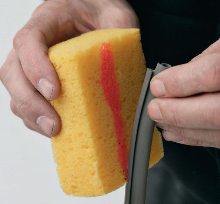 Gnid den nye tætningsliste med sulfo, så er det meget nemmere at få den til at glide ind i noten. Put sulfoen på en rengøringssvamp, og gnid så listen ind. Her bruges en Primo tætningsliste nr. 576, der er identisk med den gamle.
