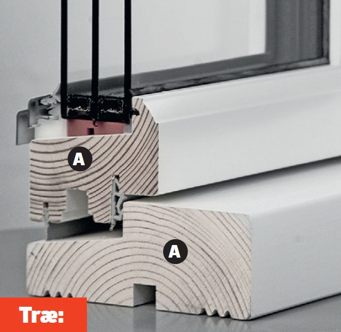 Træ-alu-vinduer kombinerer det klassiske træ med en udvendig skærm af aluminium. På den måde får du det klassiske trælook A indadtil i huset, men et (stort set) vedligeholdelsesfrit ydre B. For mange år siden var denne løsning uheldig, fordi aluminiummet dannede en kuldebro udefra og ind i huset, men i dag har producenterne løst dette kedelige problem, så træ-alu er fuldt ud lige så isolerende som rene trærammer.
