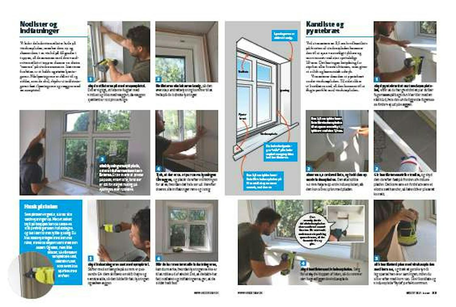 Vi lader de lodrette notlister hvile på vinduespladen, mærker dem op og skærer dem i en vinkel på 45 grader i toppen, så de sammen med den vandrette notliste i toppen danner en ekstra “ramme” på vinduesrammen. Listernes funktion er at holde og støtte lysningerne. Når lysningerne er skåret til og sidder, som de skal, skyder vi indfatningerne fast i lysningerne og væggen med en sømpistol.