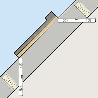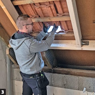 Hæft inddækningen fast til undertaget. Den plisserede del af inddækningen skal foldes omkring taglægterne og fikseres til undertaget med hæfteklammer. Derefter skal den tapes fast langs kanten.