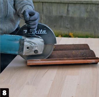 Tilpas resten af teglene. De tegl, der ikke kan lægges hele op, fordi vinduet er i vejen, skal skæres til. Det gør du lettest med en vinkelsliber med en stenklinge. Husk maske og briller. Det støver.