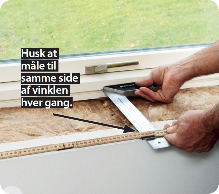 Hold vinklen op til din markering. Mål fra vinklen til begge sider af lysningen. Disse mål skal overføres til pladen. Mål både inde ved vinduet og ude ved væggen.