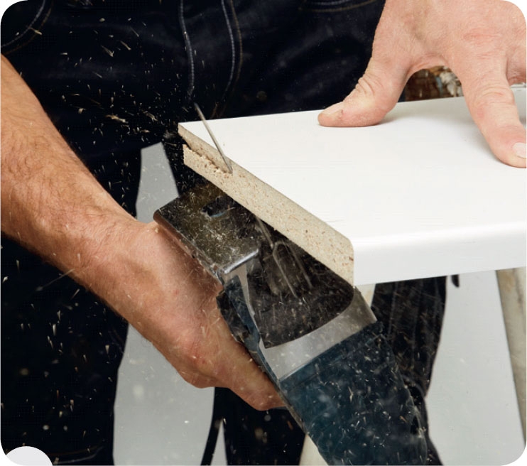 Skær pladen til med en fintandet stiksavsklinge. En laminatplade som denne skal skæres fra undersiden, fordi klingen slår laminatet i stykker.