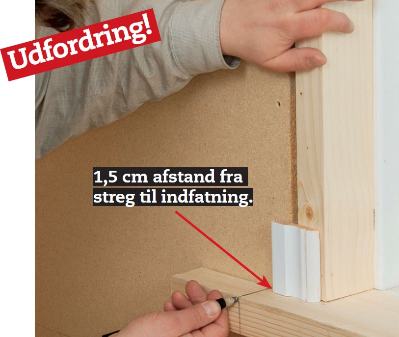 Overfør målene til de reglar, der er skåret af i de rigtige længder. Start med at måle til den øverste lysning og derefter de to sider (det er også den rækkefølge, de monteres i). Sav eventuelt lidt uden for stregen, og finjuster derefter med en høvl.