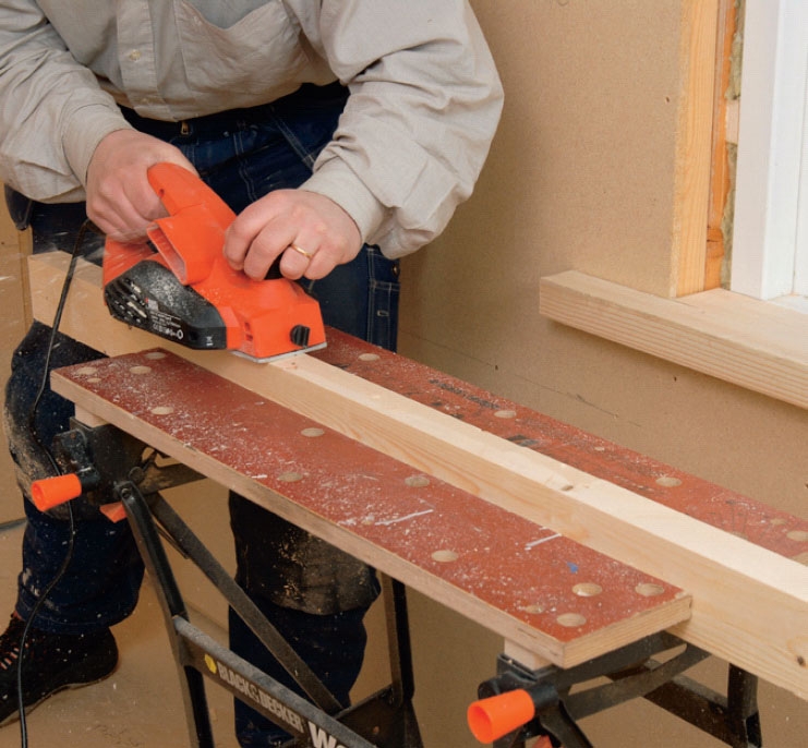 Tykkelse og bredde på det stykke træ, som du bruger til vinduespladen, afhænger af vindueshullets størrelse og væggens tykkelse. Her passede det med en 45 x 145 mm høvlet fyrre træs reglar, der blev savet og høvlet til i en tykkelse, så den kom til at ligge nøjagtig på højde med oversiden af vindueskarmen.