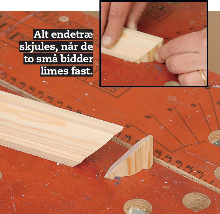 Sav dekorationslisten af på gering i begge ender. Den præcise længde finder du ved at måle 2 cm ind fra begge sider på den profil, som du tidligere har fræset på undersiden af vinduespladen. Herefter limes de to små bidder fast.