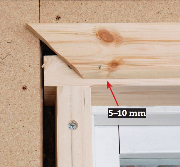 Nu mangler kun indfatningerne (E). Vi har valgt en almueliste, fordi den passer godt til husets øvrige indfatninger og paneler. Mål ud til den øverste indfatning først, og sav den af i gering (45 grader) i hver ende.